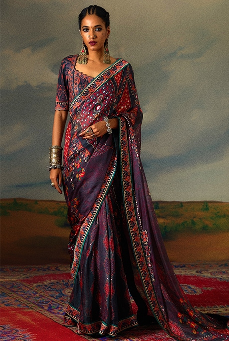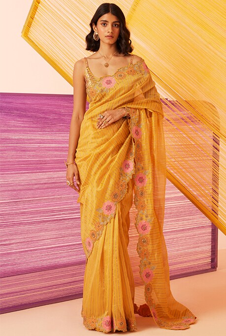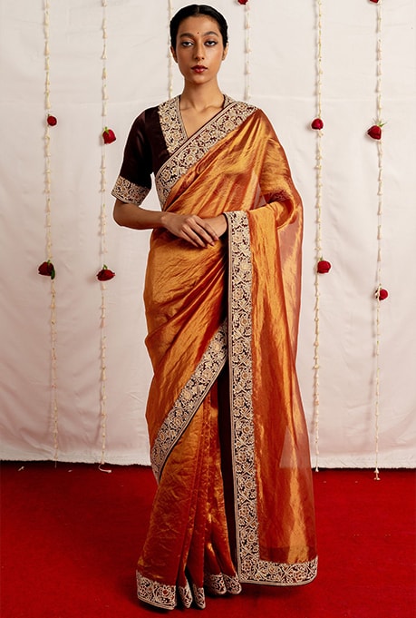 Want to incorporate a natural sheen into your celebratory closet? A Tissue silk saree is the answer. The versatile saree’s lightweight nature and effortlessness make it an ideal pick for both morning and evening celebrations throughout these 11 days. Crafted in various regions of India, this graceful select exudes femininity most understatedly, ensuring you leave a significant impact.