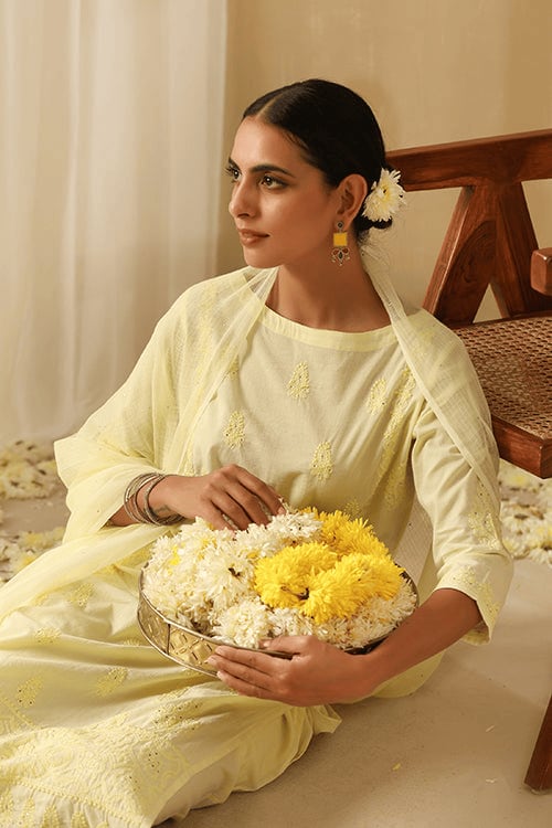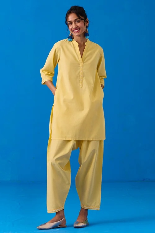 What is particularly interesting is how naturally it translates into the Indian fashion space. While Indian wear is often associated with bold, saturated colour, there’s an equally compelling shift towards softer, sun-washed tones and fabrics that feel lived-in and breathable. Butter yellow finds a natural home here – appearing in airy muls, cottons, and light silks that move with ease and make sense for the climate we’re actually dressing for. Whether it’s an everyday kurta, a co-ord set, or even occasionwear that doesn’t feel overwhelming, the shade adapts without losing its character.