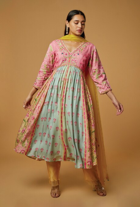 Anarkali kurtas hold a significant place in India’s rich ethnic heritage, boasting a storied history. The hallmark of this graceful ensemble lies in the flair A-line pleated skirt, available in lengths that range from knees to floor. They are adorned with intricate embroidery, sequins and other ornamental embellishments that add a touch of opulence. Typically, they are paired with narrow leggings which creates a striking contrast to the voluminous silhouette. The Pink & Grey Digital Printed Kurta Set by Siddhartha Bansal is a stunning example which epitomises classic splendour. For those who prefer an alternative to leggings, opt for straight pants like the one in Neha Khullar’s Lilac Chanderi Silk & Mulmul Embroidered Kurta Set, which adds a subtle charm to the outfit.