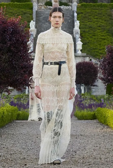 However, the 17th-century venue was not the only historic element in this show. Chiuri was heavily influenced by Mary, Queen of Scots, while designing and conceptualising the collection. The lace on the garments refers to the embroidery Mary made while imprisoned.