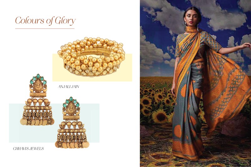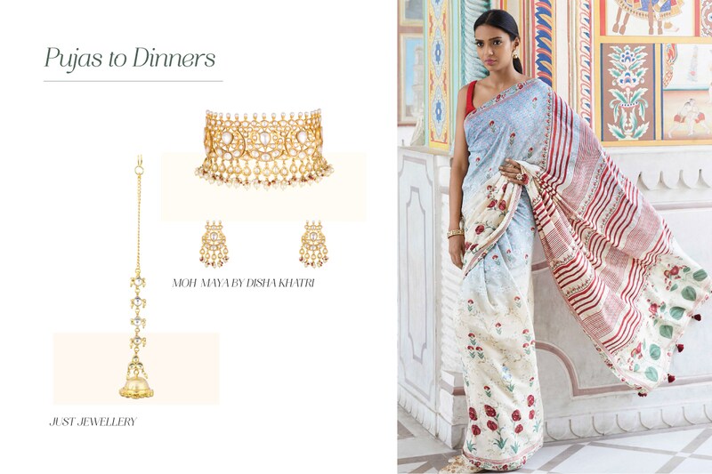 If festive visits and pujas are on your plan of action for the day, go for breezy sarees to move easily. This vibrantly printed saree by Anita Dongre epitomizes elegance and vivacity all at once. Give the look a Rajasthani spin with a Borla maangtika and choker necklace.