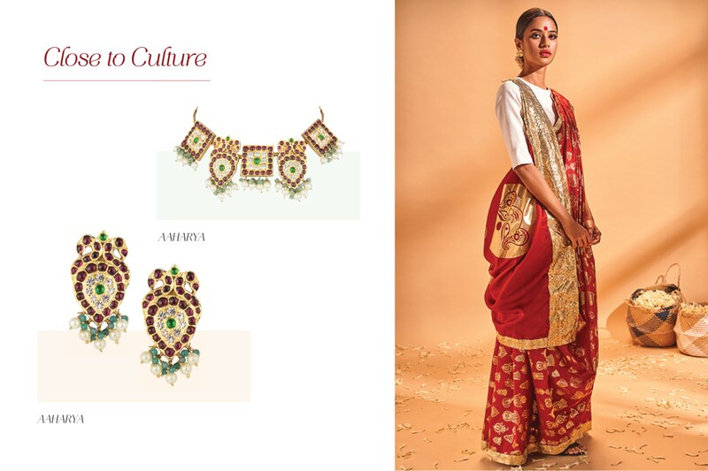 Quintessential Bengali sarees for Durga Puja is a divine match. Masaba, with her new festive line, made the style covetable than ever with traditional red sarees featuring a Durga figure on its drape. All you’ll need are some heirloom-worthy jewellery pieces to accentuate the glow.