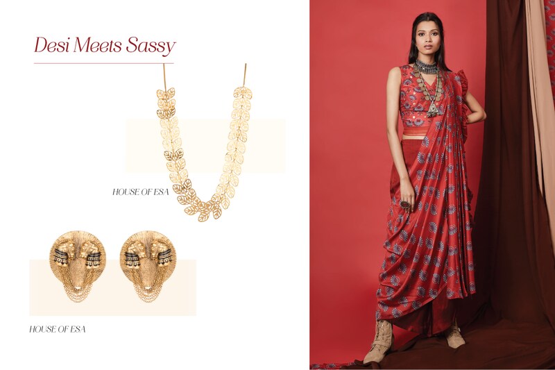 Rethink festive elegance with a fusion flair this season. Place your bids on bright colours fused with artsy drapes to take it up a notch. Raise the bar in this dhoti saree by Riraan. Statement tribal-inspired necklaces and danglers go effortlessly to punctuate the look.