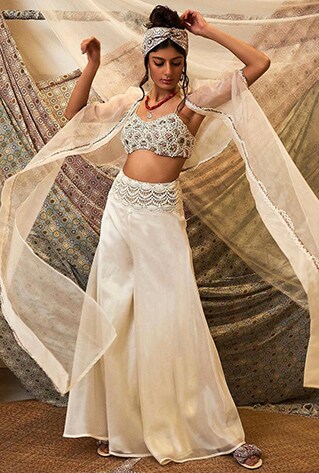 With her affinity for layers and textures, Ridhima Bhasin constructs the classic staples of Indian festivities with contemporary styling. Boasting of the perfect blend of ethnicity and modernity, light and fluid pre-attached dupattas go perfectly with high-octane shenanigans and dancing while her wispy capes shine out like an extra layer of grandeur to make you the belle of the ball. Statement blouses are big this season so if you’re looking to take the drama high-octane, a perfect power play of drapery is all you need. Customized with pre-draped dupatta extensions, a Ridhima Bhasin anarkali is the most-loved piece from her repertoire.