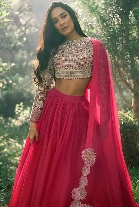 Borrowed from the Victorian Era, corset blouses are just perfect for finding a leeway from the same old silhouettes or overdone styles. If you have a well-toned hourglass figure, don’t shy away from flaunting your curves by choosing a corset-paired lehenga. Pull off this effortlessly ultra-feminine statement piece and raise the bar with your upbeat mojo at the next wedding soiree.