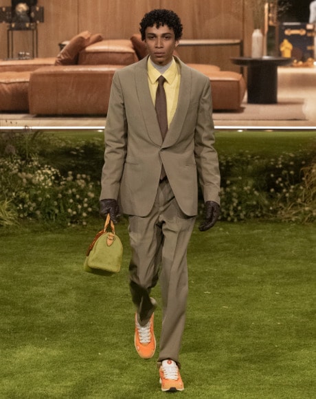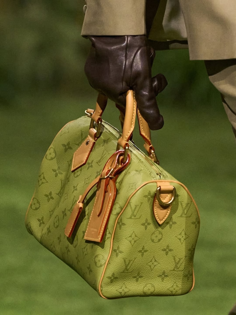 The colour story remained largely neutral, grounded in shades of grey, beige, and black, punctuated by deliberate flashes of red and yellow. These accents added warmth and energy without overpowering the restrained palette. The bags mirrored this mood through Monogram Vintage Vernis designs – suede finished with a high-gloss lacquer, exuding an effortless flexibility that captured the spirit of the future dandy.