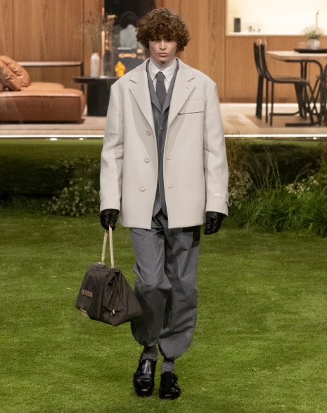 Within this setting, menswear classics anchored the collection. Double-breasted tailoring, gentlemanly overcoats, Harrington jackets, and cable-knit sweaters felt familiar yet refined. Rather than dramatically reworking silhouettes, the focus remained on proportion, allowing subtle shifts in texture and construction to define the season.
