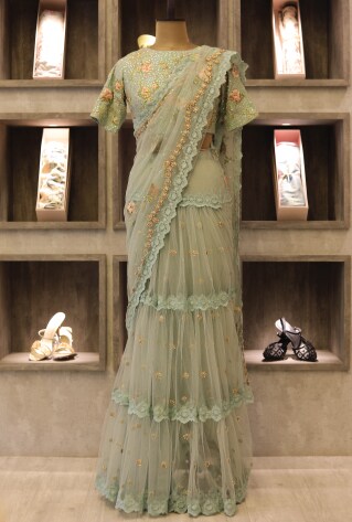 My collection always has hand embroidered french wire with lots of pearls, resham threads, beads jewelled on pastel hues. The silhouettes are easy and light.