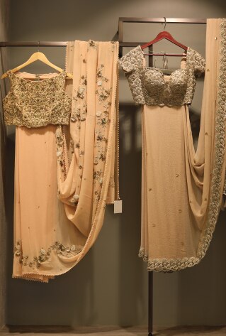 My collection always has hand embroidered french wire with lots of pearls, resham threads, beads jewelled on pastel hues. The silhouettes are easy and light.