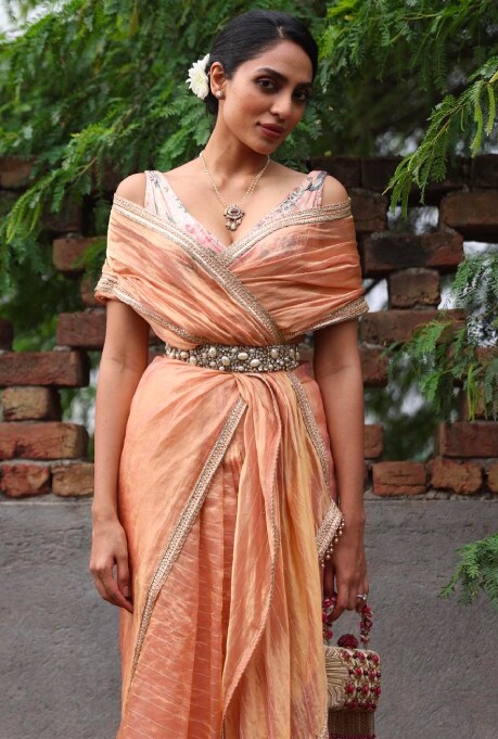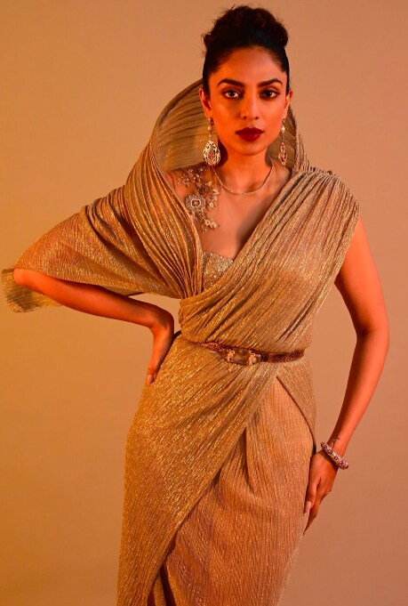 In season two’s announcement poster, Dhulipala was seen in a champagne gold gown with a structured hooded drape from Tarun Tahiliani. Another stunning creation from the eponymous label, a delicate blush pink Banarasi tissue saree, was worn by the actor in one of the wedding scenes.