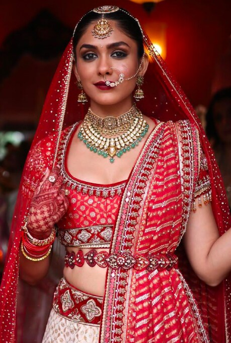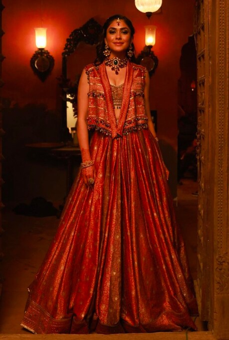 One of the most talked-about episodes this season saw Mrunal Thakur, playing Adhira Arya, former Miss India turned actor, in Tarun Tahiliani’s opulent designs. The actor twirled in a multi-coloured brocade lehenga with a matching blouse and a gilet jacket from the eponymous label in the Garba scene. Ornated with meenakari, gota, aari and sequins embroidery, the silhouette had the perfect dose of traditional and modern elements. For the mournful wedding, Mrunal Thakur was seen in a regal ivory & red embroidered lehenga set adorned with sequins and kasab embroidery. Paired with a handloom dupatta, and a crystal-embellished veil, the couture masterpiece pays homage to Jain and Punjabi heritage through the colours and textiles.