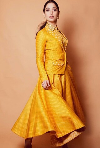 Here’s winter layering done right! We can’t stop fangirling over Tamannaah Bhatia’s dramatic flamboyance in this Punit Balana! If making a noticeable entry is what you wish, place your bets on this cropped-lehenga-shirt-blazer set.