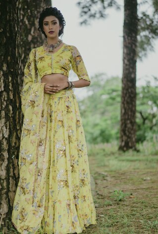 Find a leeway from traditional and formal bridal hues like red and blush tones and invest in a vibrant pick that makes it versatile for other festivities. A bright yellow twirly lehenga with modern cuts will perfectly transition you from a low-key Mehendi sundowner to the main sangeet night. The outfit smartly adds to your well-curated trousseau while you save huge rather than spending on a magnificent ensemble.