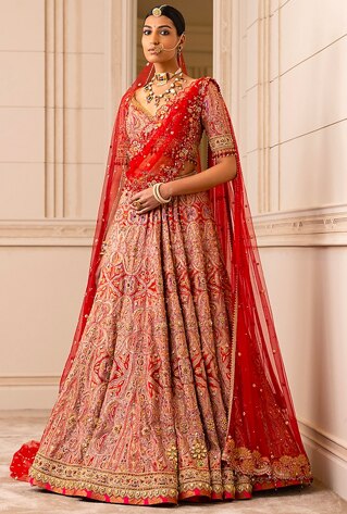 Long trailing veils have been following the bride on the aisle for ages in the West. The iconic statement made by Katrina Kaif and Alia Bhatt adorning the sari with a floor-grazing veil has added the most refreshing trend to the bridal pin board of 2022. Invest in a beautiful sheer veil to incorporate the charm of a white wedding with your traditional nuptials. Make a momentous entry by choosing new-age veil-clad lehengas by Varun Bahl. For a rooted statement, Tarun Tahiliani’s top-to-toe red iteration signifies a token of history as well as global influences.