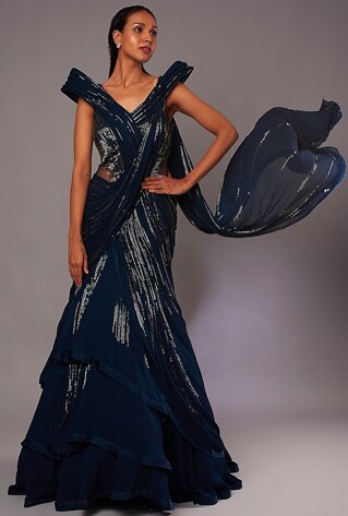 A woman never forgets her first— the earliest memory of wearing the sari. And wearing it as a newly wedded holds a special place for the right reasons. The classic six-yard ruffle sarees have a charm that can outlive fads. It has a transformative power that lets you experiment with it in umpteen ways. The pre-draped renditions, on the other hand, carry the narrative of iconic style statements of this decade into the future. Gaurav Gupta’s signature sculpted iteration offers an enchanting allure one would love to hold on to. Torani imbibes a romantic charm into the pre-draped sari with noteworthy ruffles and a statement blouse.