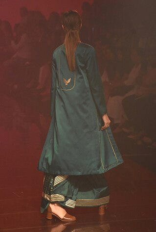 “Moulin Rouge is inspired by the Jazz age and art deco of the ’20s and ’30s. Unlike my earlier collections, Brocades are only a part of this collection. The collection features highly stylized garments with the influence of architecture, a hint of statement embroidered motifs (notice the embroidered eagle) and about seven to eight prints including gold leaf printing.”