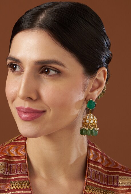 Time has proven that nothing quite beats the charm of heritage designs rooted in tradition. From auspicious festivities to weddings and post-wedding celebrations, traditional jewels are cherished for a lifetime. Instead of going for high-investment gold, opt for a gold-plated Kundan choker in 92.5 silver- like the one by AAHARYA. Set with pearls and green stones, this piece exudes a fluent harmony of modern and cultural elements. Pair it with exquisite polki jhumkas from KAARI and complete your wedding day look with ultimate grace and style. For your wedding trousseau, add more heritage pieces like kundan bangles that you can repeatedly return to.