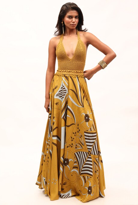 One of the older art forms in the world, crochet is yet another super elegant and airy pick for summer dresses. A well-crafted crochet dress can become an equally good beach wear and night-out fit, making them a timeless investment. Just like lace, crochet pieces, too, are works of art that can help you garner compliments wherever you go. Ulla Johnson and Ermano Scervino’s spring-summer 2024 lineup saw breathtaking crochet designs perfect for summer soirées. A very close resemblant of the pastel yellow crochet dress from Scervino’s collection is the halter maxi dress from the Indian label Kritika Murarka. Summery tropical print paired with a crochet plunging neckline makes this piece a must-have in your wardrobe! Consider styling it with a beaded silver necklace to achieve that perfect boho look.