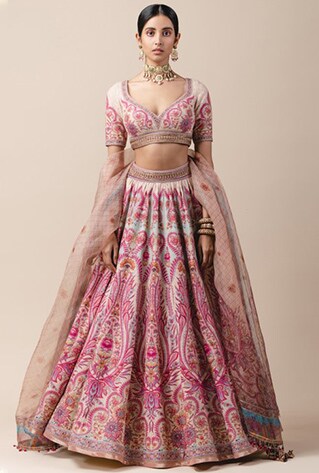 With playful pastels, metallic tones and vintage red hues, the Spring-Summer drop features the perfect bridal outfits. The beautiful lehengas are adorned with zardosi, kundan and Swarovski crystal embroidery as well as jamawar and floral prints. We also get to see Persian Jaali inspired laser cut embroidery in the collection. It is further highlighted with kasab and kundan work.
