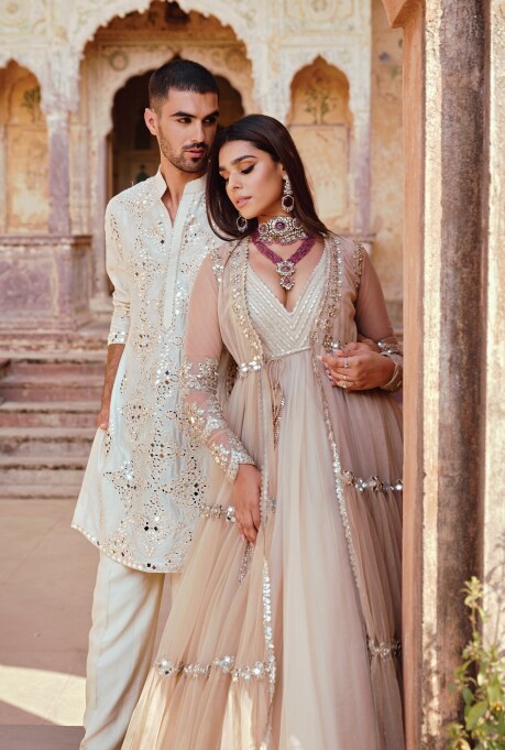 AM: I draw inspiration from the rich heritage of India along with our history in art and architecture. Mirrors have been an integral part of Indian textiles for centuries. They add opulence, glamour, and vibrancy to my designs, reflecting light and enhancing visual appeal. They celebrate traditional craftsmanship and the transformative power of self-reflection. In a fashion landscape dominated by heavy embroidery, borders and sequins, mirrors set my designs apart, offering a unique aesthetic that combines tradition with contemporary flair.