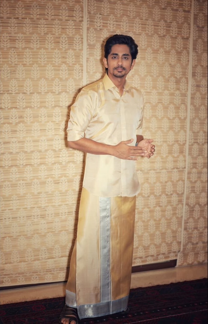 Capture the spirit of Onam in true traditional style – take cues from Siddharth in a cream silk shirt paired with a golden kasavu veshti, effortlessly blending comfort with festive elegance.