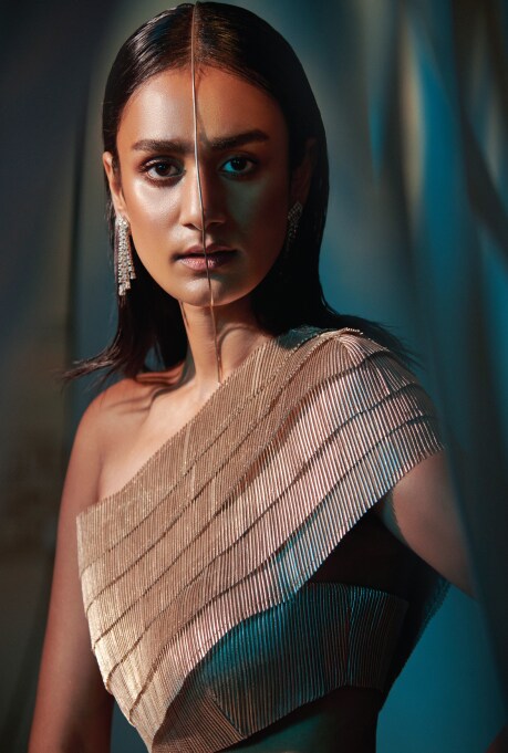 Couturier Rimzim Dadu delves into the world of her futuristic textiles and molten metallics as she gives a lesson in smart and sharp cocktail dressing. Read on to discover how she treats diverse materials in her daring design ‘lab’ and makes everlasting statements with her ensembles.