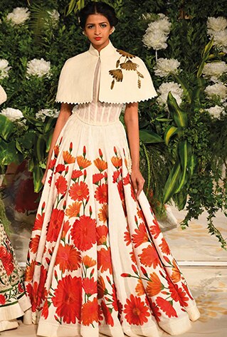 Art & versatility is the core focus of his contemporary wedding wearables. Placing supersized flowers on bewitching dark hues, he turns dreamy visuals into reality. His wedding couture defines a new take on bridal fashion every season. A new-age bride can channel her own modern individuality with a definitive flair, making a lasting impression of her big day. His artful affinity with botanical patterns is formulated in a bold tone in his collections. Whether you’re a bride-to-be or a fashion-forward wedding attendee, your wedding wardrobe isn’t complete without the dose of art illustrated in Rohit Bal lehengas, ruffle sarees, anarkalis and their indo-western hybrids.