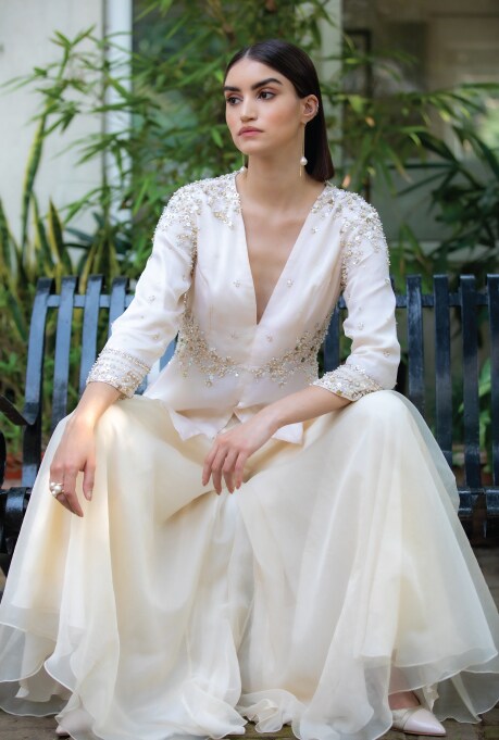 The idea is to celebrate global lifestyles keeping Indian craftsmanship and weaves at the heart of the overall aesthetic. Pairing re-wearable crop tops with lehengas, mixing and matching separates can serve as trendy examples. Wirk claims, “People aren’t looking for over-the-top garments anymore, they like to mix silhouettes.” Expressing her love for pre-draped saris and dhoti pants, she adds that these outfits can be worn in many different ways and can be easily transformed into day or evening wear as required.