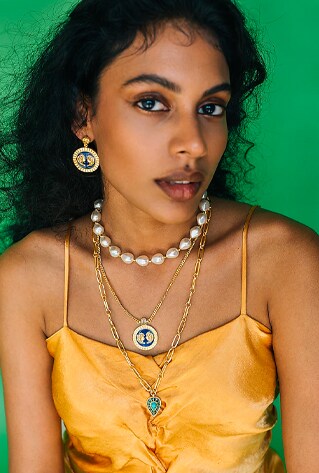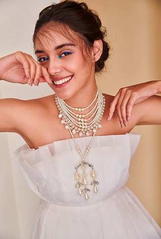 Whether you’re clubbing, pairing or layering— the rule is to have a moment. Curio Cottage‘s crystal-studded necklaces can pair effortlessly to complement your ball gowns and cocktail saris. Whereas, the cascading layers of oyster pearls and crystalline stones are the easiest to throw on. Experiment with everything— from kaftans to bustiers and structured blazers.