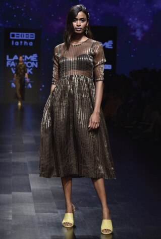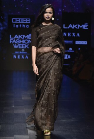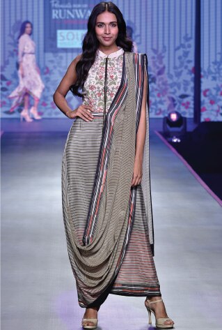 Geometric patterns get all bold and frivolous for Papa Don’t Preach . Leheriya stripes and chevron prints are rendered with OTT textures and embellishments for a futuristic flair. While Platform 9 is garnering a fanbase by pairing polka dots with stripes and checks, Latha Puttana decided to give it an ethereal touch interpreting geometry through see-through self-design on wispy handwoven fabrics.