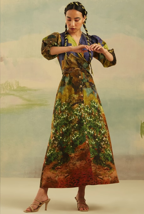 The brand Khara Kapas’ very name translates to ’’pure cotton’ in Hindi. Their design philosophy is built on minimalism and timelessness which is seen in their clean-cut dresses and fantastic use of colours. All their pieces feature vivid hues, tie-dye patterns & ethnic motifs, perfect for casual and occasion wear.