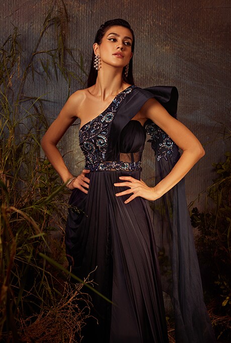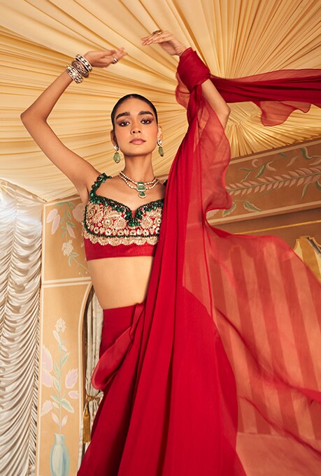 If you’ve RSVP-ed to a couple of destination wedding getaways this season, concept sarees are a must-pack. For essence, pick a risque pre-draped saree that can translate well to a cocktail-cum-sangeet night where you wouldn’t have to think once while grooving the evening away. Saree gowns are perfect for when you want to dial up the drama. For a modern take, replete with volumes, drapes, belts, and capes.