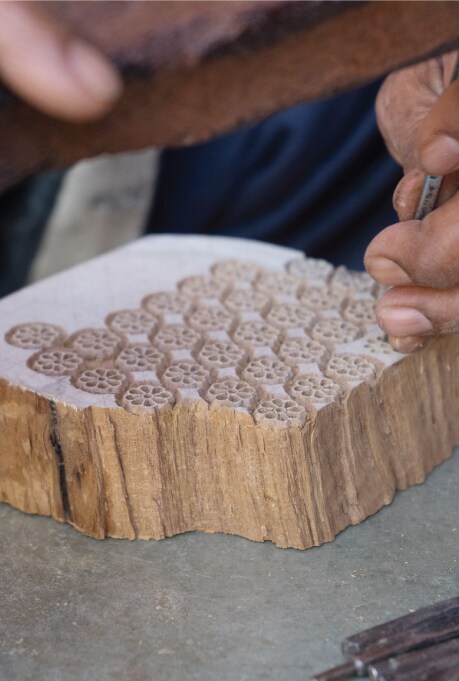 The foundation of block printing is the ‘wooden block’ primarily made of lime, holly, sycamore or pear wood. Though they may vary in size, the blocks are always cut two to three inches thick. What follows is preparing these blocks for carving the desired designs by dampening them. After the blocks are ready, the printing process commences by preparing the dyes to achieve the preferred hues.