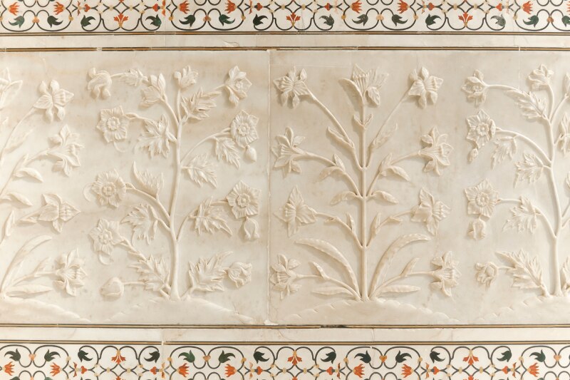 Floral carvings on the Taj Mahal, Agra, India.