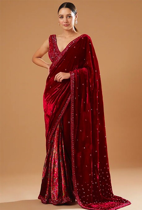 Looking for a break from traditional silk sarees? Velvet sarees are the way to go, as they possess distinctive charm; these unique ensembles are all about texture, elegance, and richness. These sarees have a way of clinging to the body that feels like a dream, emphasising your curves in all the right places. There is an array of shades to choose from, like wine purple, maroon, and bottle green if you’re heading to a grand occasion. Have a look at designers like Torani, Divya Aggarwal, Priyanka Jain, and RI Ritu Kumar, among many others, to find a velvet saree that fits your style.