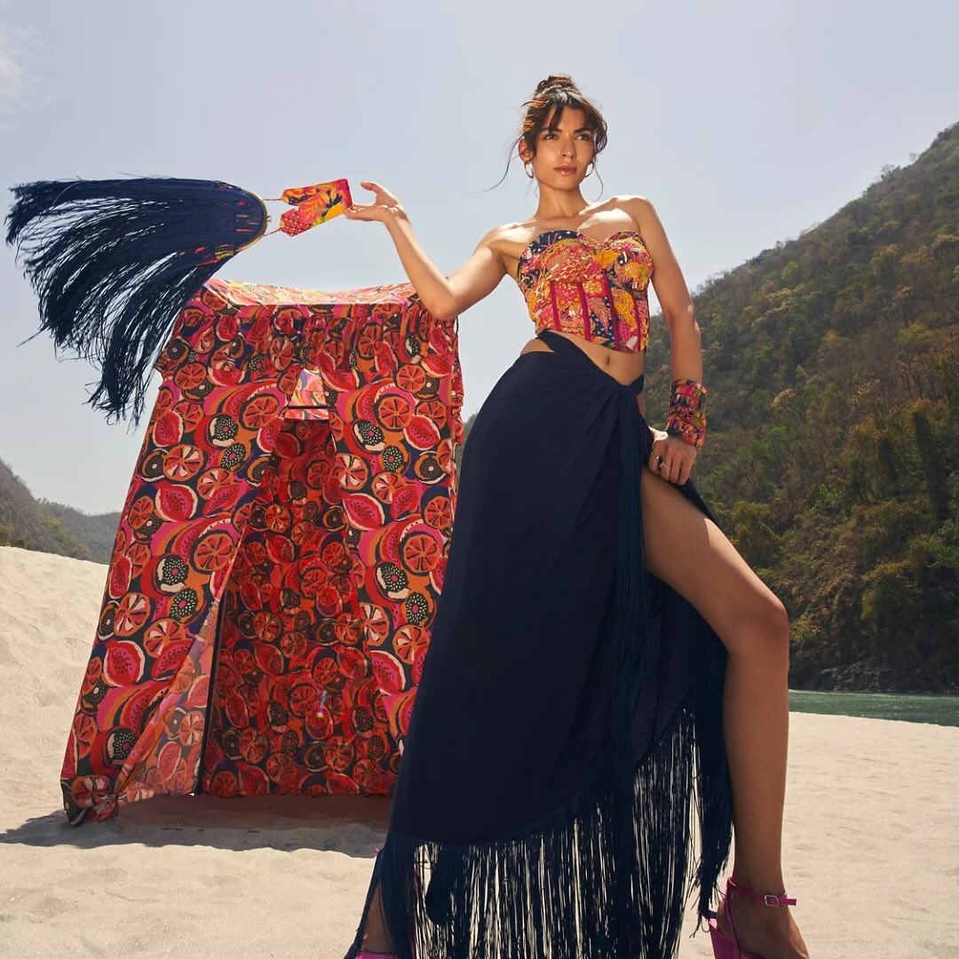 For vacation wardrobes that feel artistic yet effortless, Rishi & Vibhuti offers the perfect balance. The Delhi-based label is known for its expressive prints and relaxed silhouettes that translate beautifully into resortwear. From kaftans to breezy dresses, each piece feels comfortable while making a statement, capturing the effortless elegance of holiday dressing.
