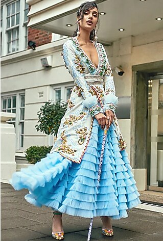 Practicality meets joy in the vibrantly colour-splashed jackets by Papa Don’t Preach. Whether you wish to modernize your lehenga or primp up a mundane sari, make them your first port of call to brighten up the festivities. After all, high-octane drama should be your mood when you’re experimenting with layers.