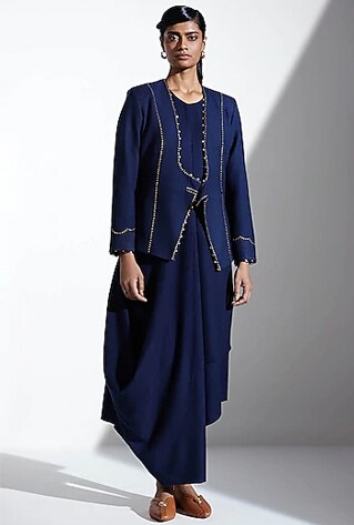 With the penchant for fuss-free tailoring, AMPM adapt their jackets as a stand-alone piece. While their asymmetric velvet bandhgala-peplum hybrid is fierce and feminine, both at once. Another blazer is studded in the silhouette of a waistcoat. Whether you wish to make a statement at the formal dinner or top off your festive look with something edgy, this piece is best to place your bets on.