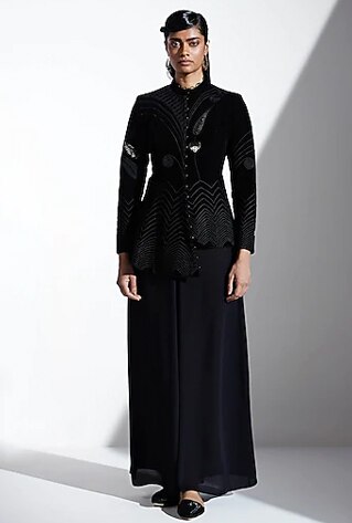 With the penchant for fuss-free tailoring, AMPM adapt their jackets as a stand-alone piece. While their asymmetric velvet bandhgala-peplum hybrid is fierce and feminine, both at once. Another blazer is studded in the silhouette of a waistcoat. Whether you wish to make a statement at the formal dinner or top off your festive look with something edgy, this piece is best to place your bets on.